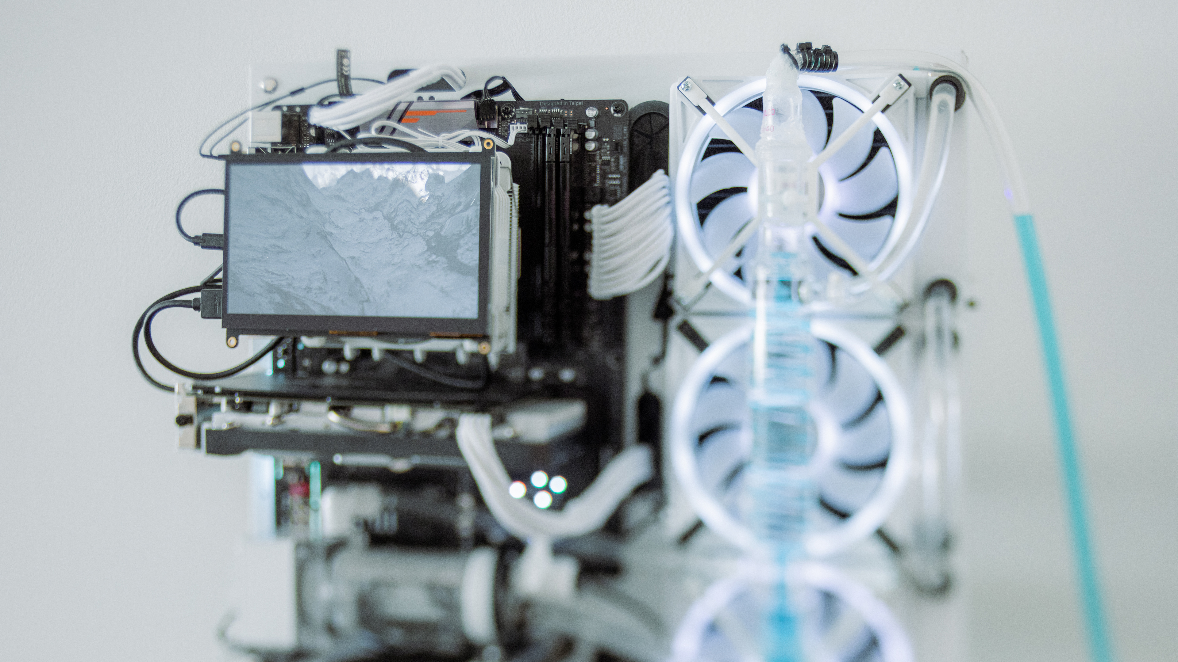 This machine also functions as a cooling mechanism, regulating liquid heated by video processors and thermoelectric assemblies. By merging physical cooling processes with procedural simulations, LTEJS investigates the interplay between environmental data and its visual and physical representations, offering a distorted depiction of Arctic landscapes.