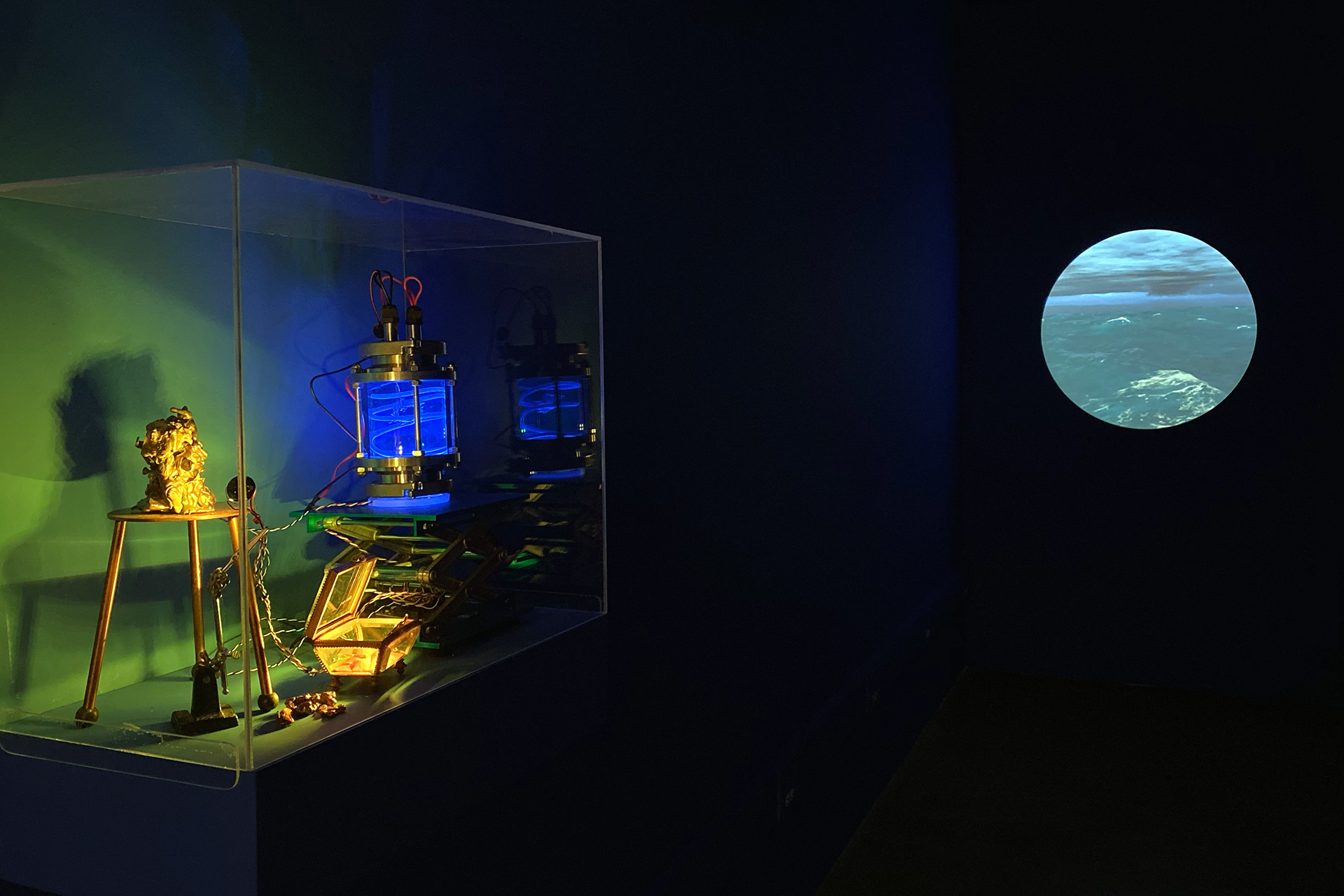 Before reaching the ocean, the signal interacts with an "ore" chemically refined from e-waste metals and minerals, including gold, palladium, coltan, and neodymium. Additionally, the signal powers a continuous chemical process that grows a copper ring, displayed in an antique ring box once owned by Helena Petrovna Blavatsky, co-founder of the Theosophical Society.